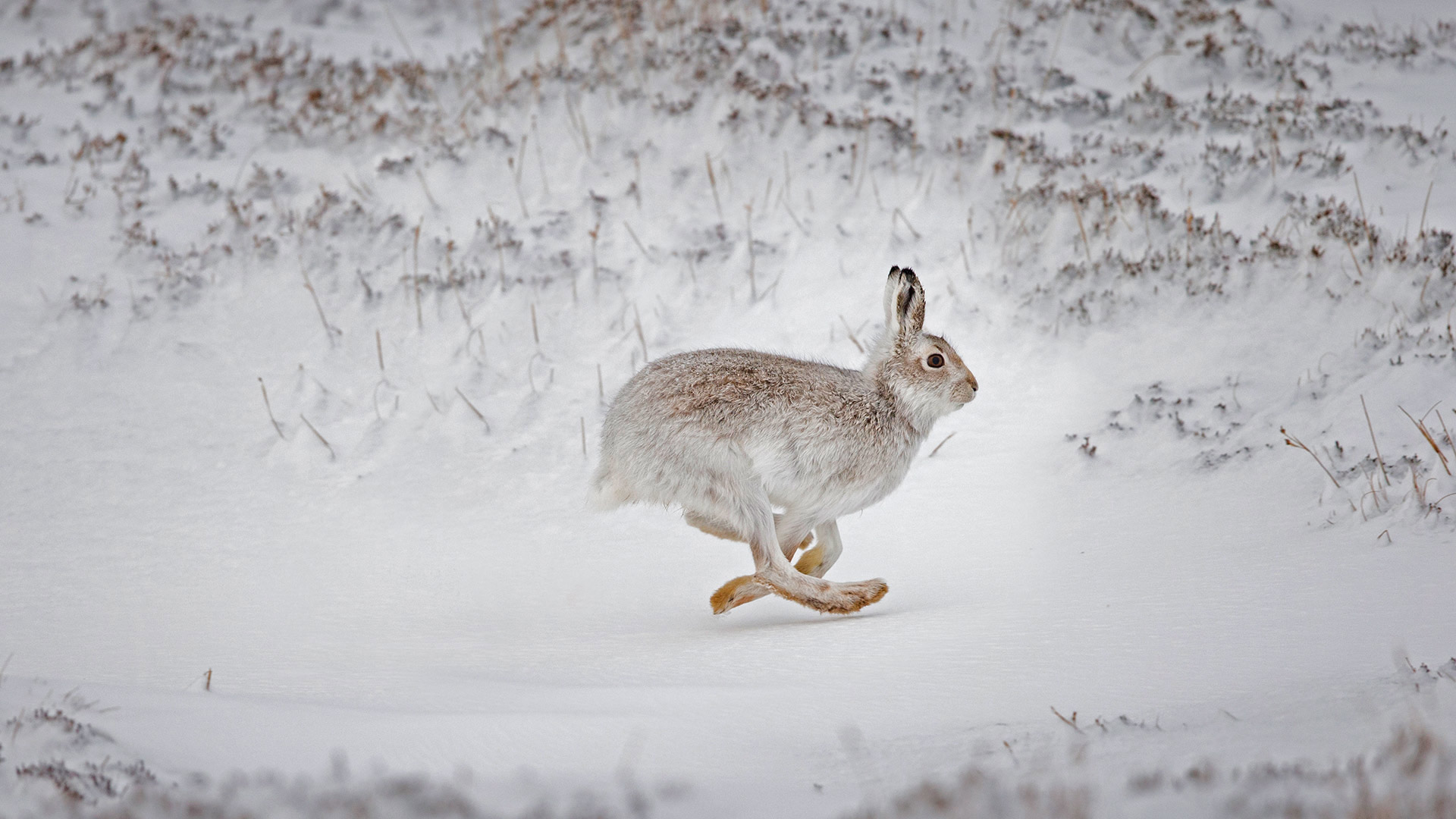 Mountain hare running across snow-covered upland