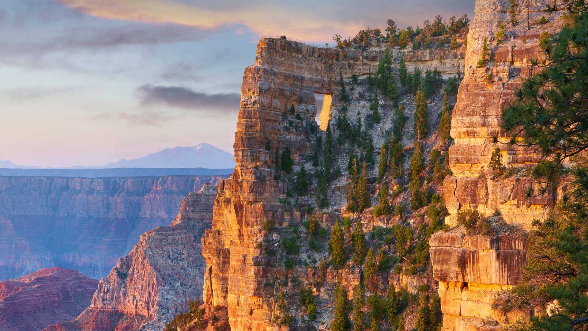Peekaboo view of Angels Window on the North Rim of the Grand Canyon, 亚利桑那州 (© Tim Fitzharris/Minden Pictures)