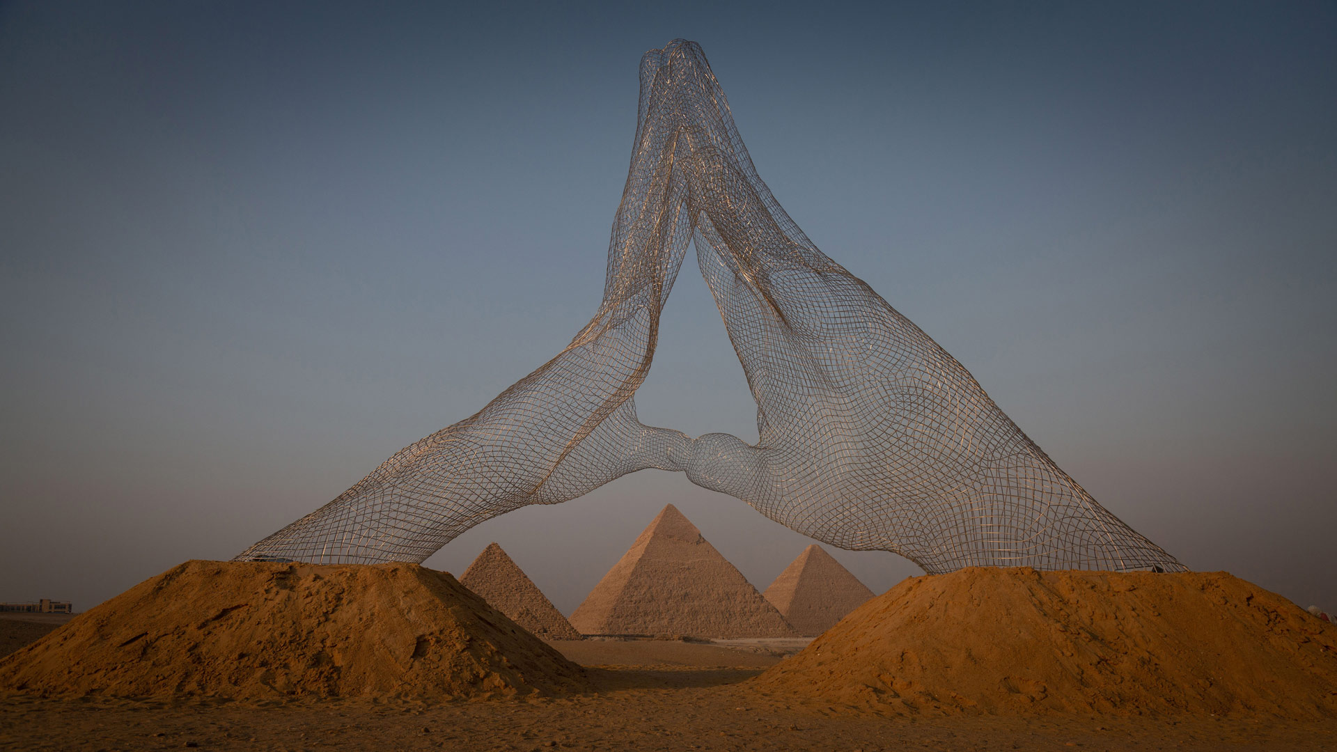 'Together' sculpture by Lorenzo Quinn, Great Pyramids of Giza, 开罗, 埃及 (© Sima Diab/盖蒂图片社)