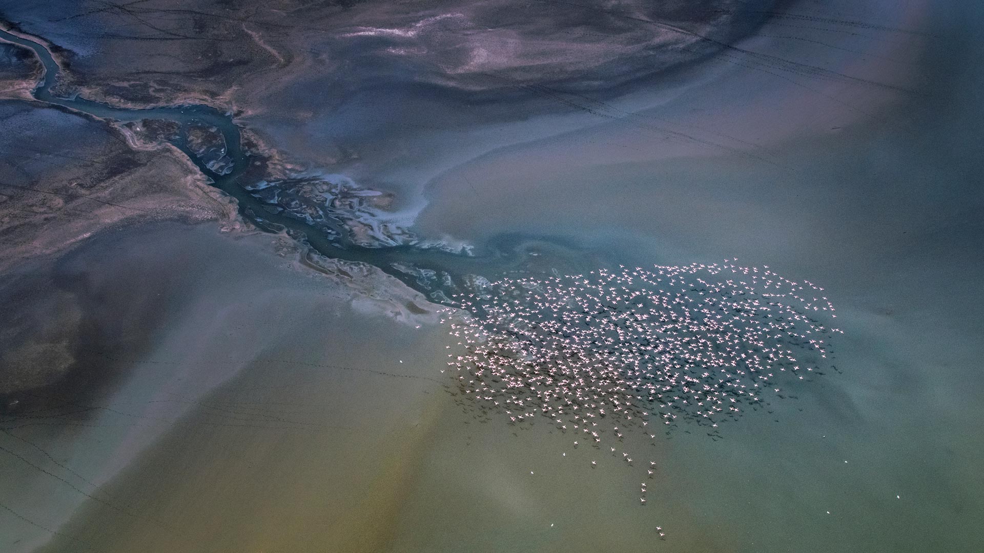 Lesser flamingos flying over Lake Magadi, 肯尼亚 (© 维基·乔伦, Babylon and Beyond Photography/盖蒂图片社)